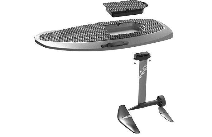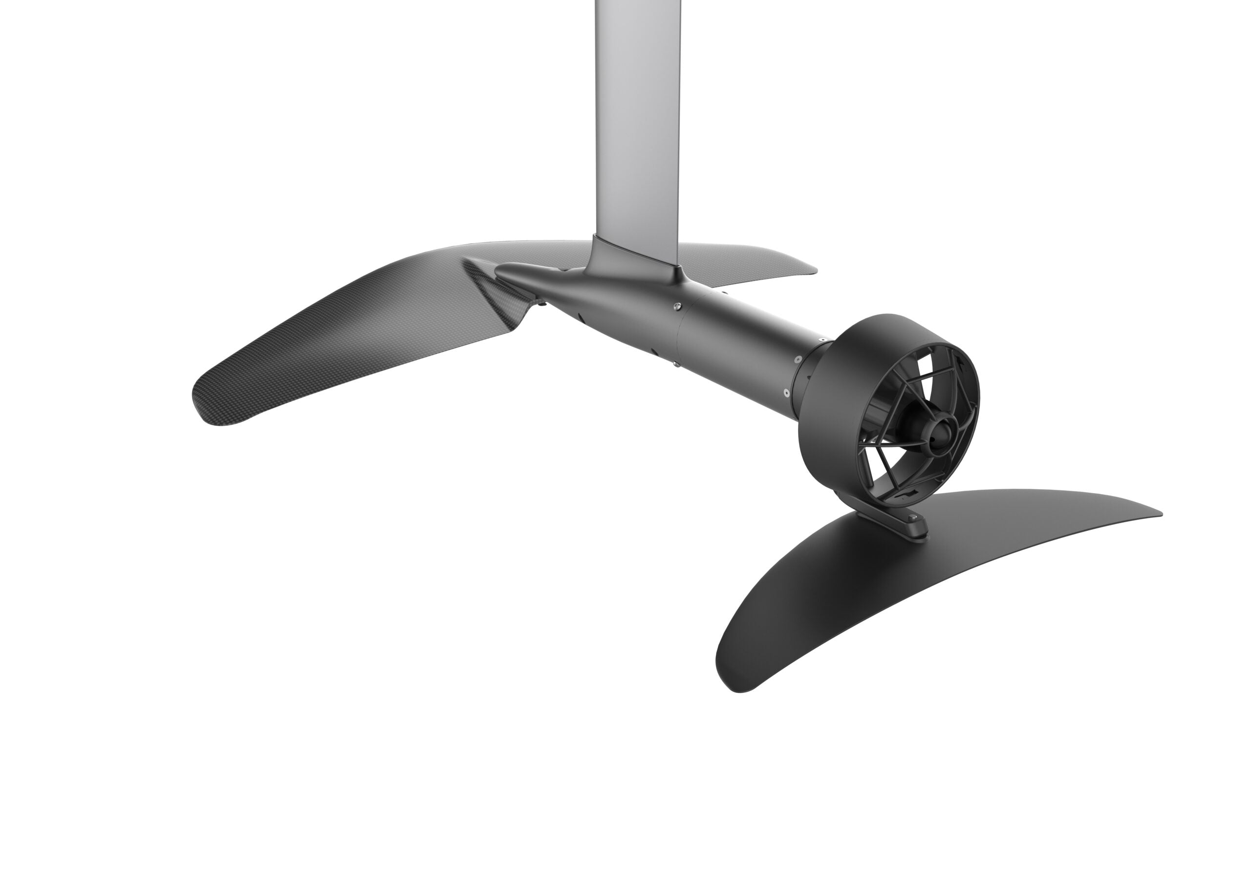An E-foil takes the inflatable wing & hydro-foil board concept and replaces the wing with rechargeable battery power to propel the user using an integral propeller system. The board flies above the water’s surface due to the hydro-foil, which creates lift basically following the same process as an airplane wing. The user has ultimate control over the propulsion and speed via a Bluetooth-linked remote control attached to the wrist.